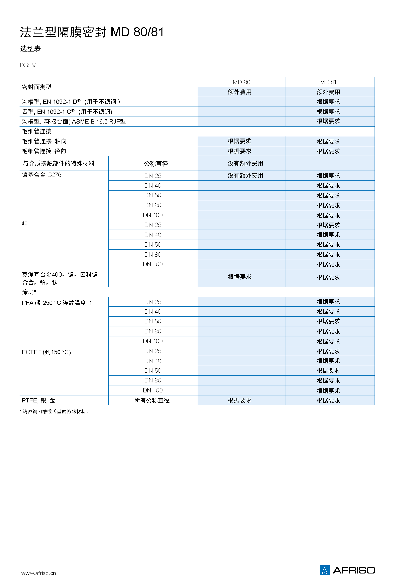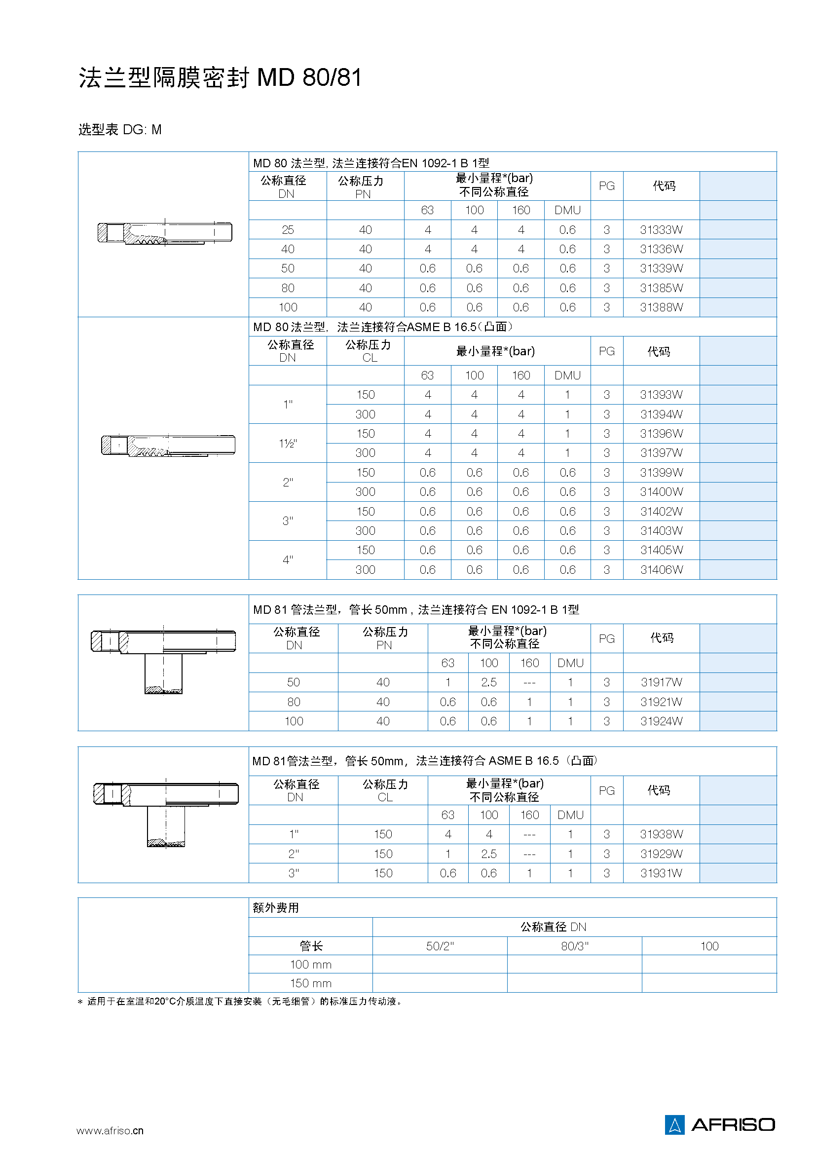 不銹鋼 316L 法蘭連接符合EN 1092-1 Form B1 DN 50至100或 ASME B 16.5(凸面)DN 1" 到 3" 法蘭頭部長50, 100, 150 mm |