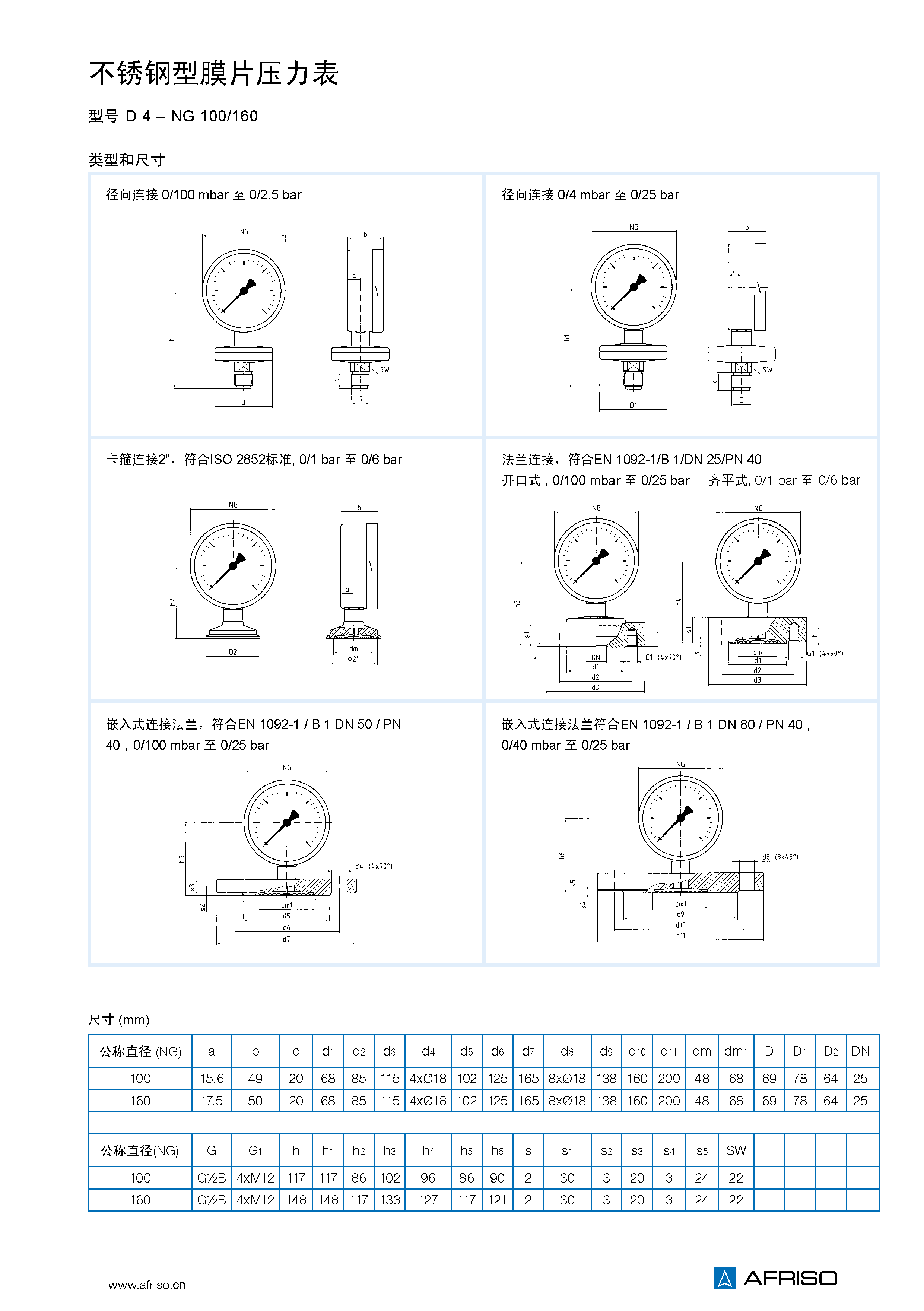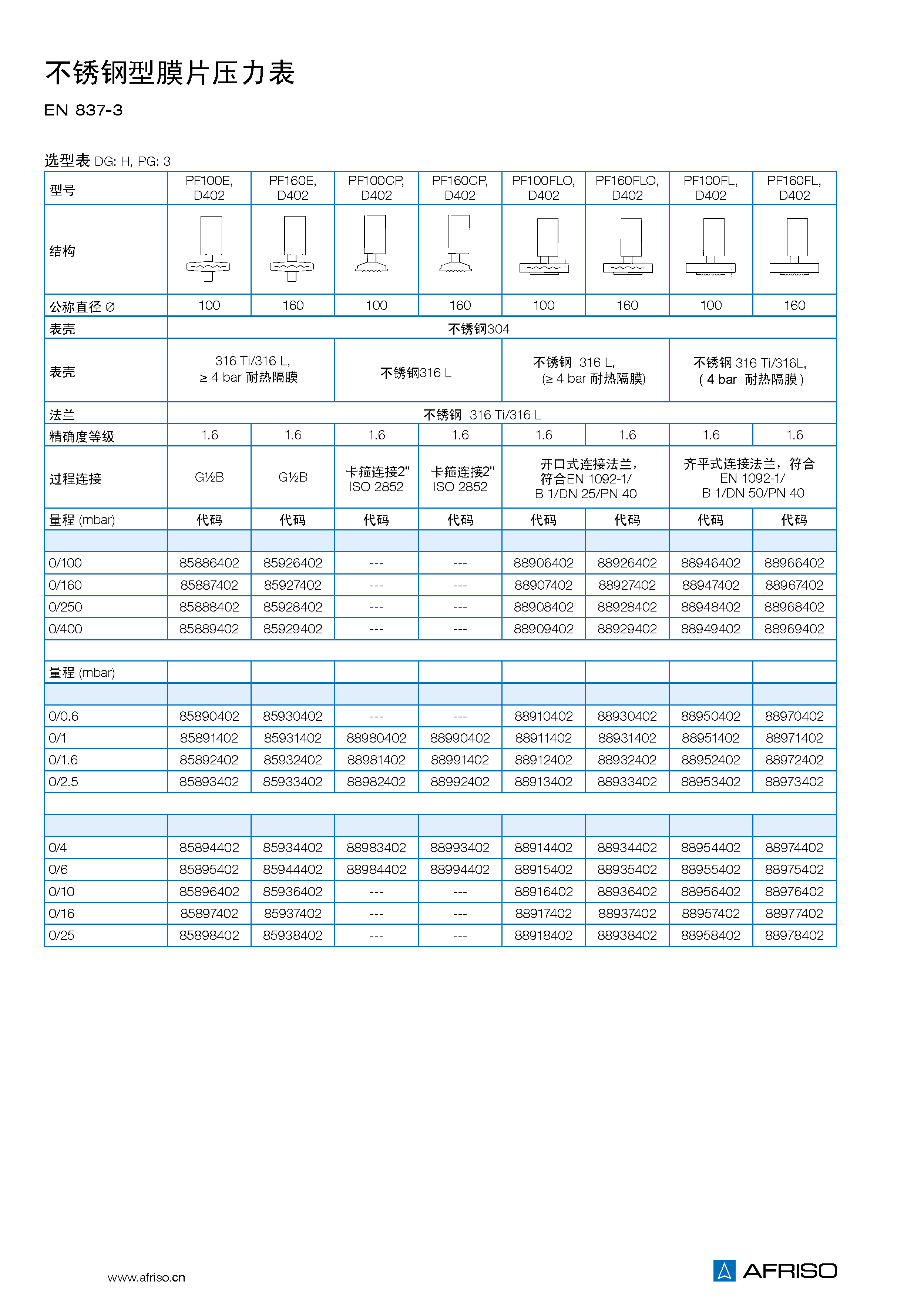 隔膜10 KPa 到0.25 MPa 不銹鋼316 Ti/316 L, 0.4 MPa 到 2.5 MPa 耐熱隔膜 |