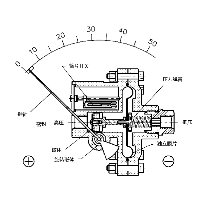壓力作用在被膜片隔開的兩個(gè)壓力腔內(nèi)。如果兩壓力腔的壓力有差異,膜片通過一個(gè)磁鐵頂著彈簧產(chǎn)生位移,這個(gè)位移通過裝在指針座上的電磁線圈傳遞給指針。壓差直接由指針指示。 |