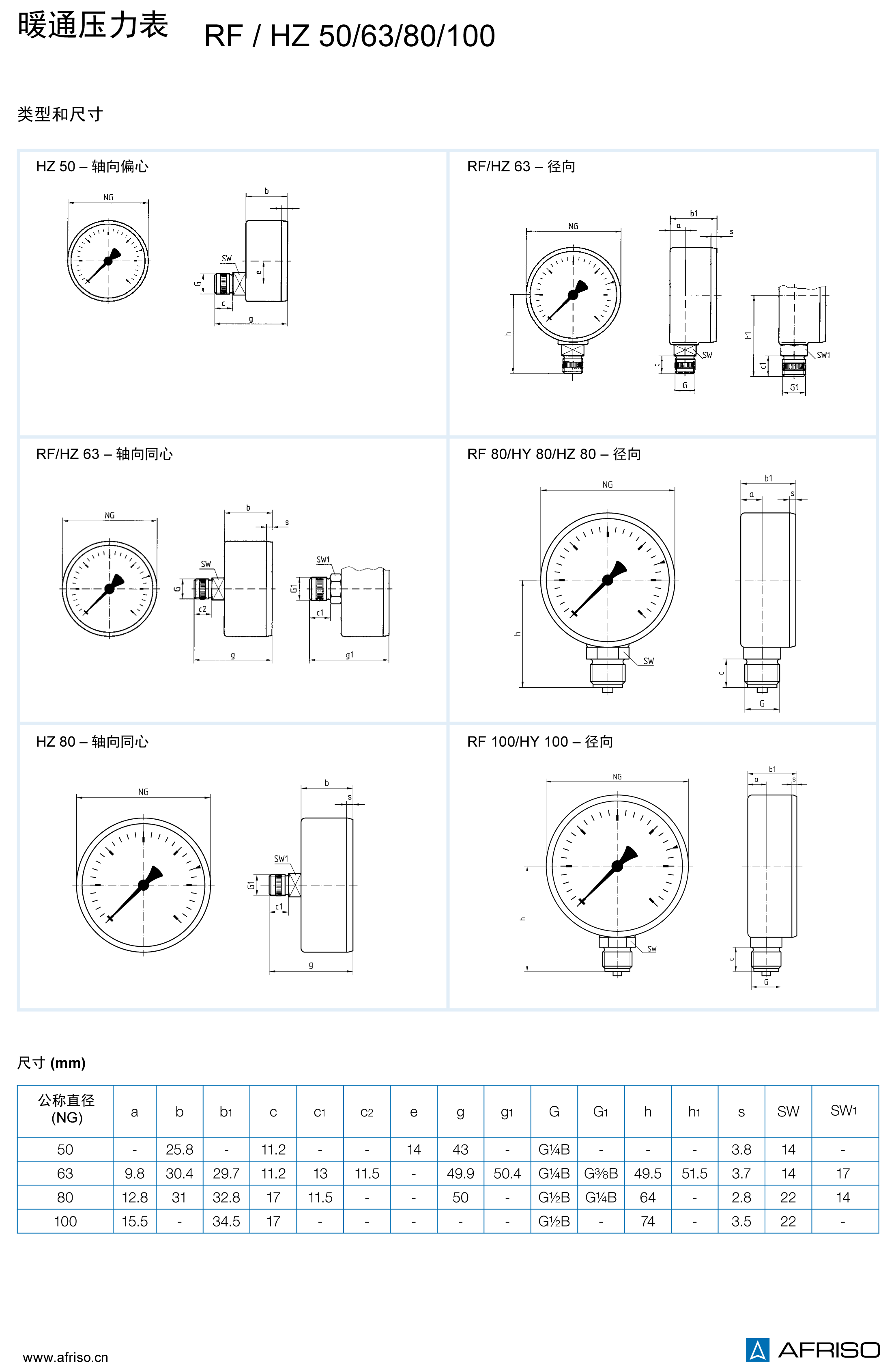 暖通壓力表NG 50-63-80 用于閉合供熱系統 范圍:0/0.4 MPa 過程連接:NG 50G?B軸向偏心; NG 63G?B或G3/8B軸向/徑向同心 NG 80G?B徑向或G?B軸向同心(帶G? x G?閥) 在刻度0.25MPa或0.3MPa處有紅色標記,0.15-0.25或0.3 MPa間有綠色扇形標識 儀表玻璃上印有紅色可調參考指針和綠色扇形標識