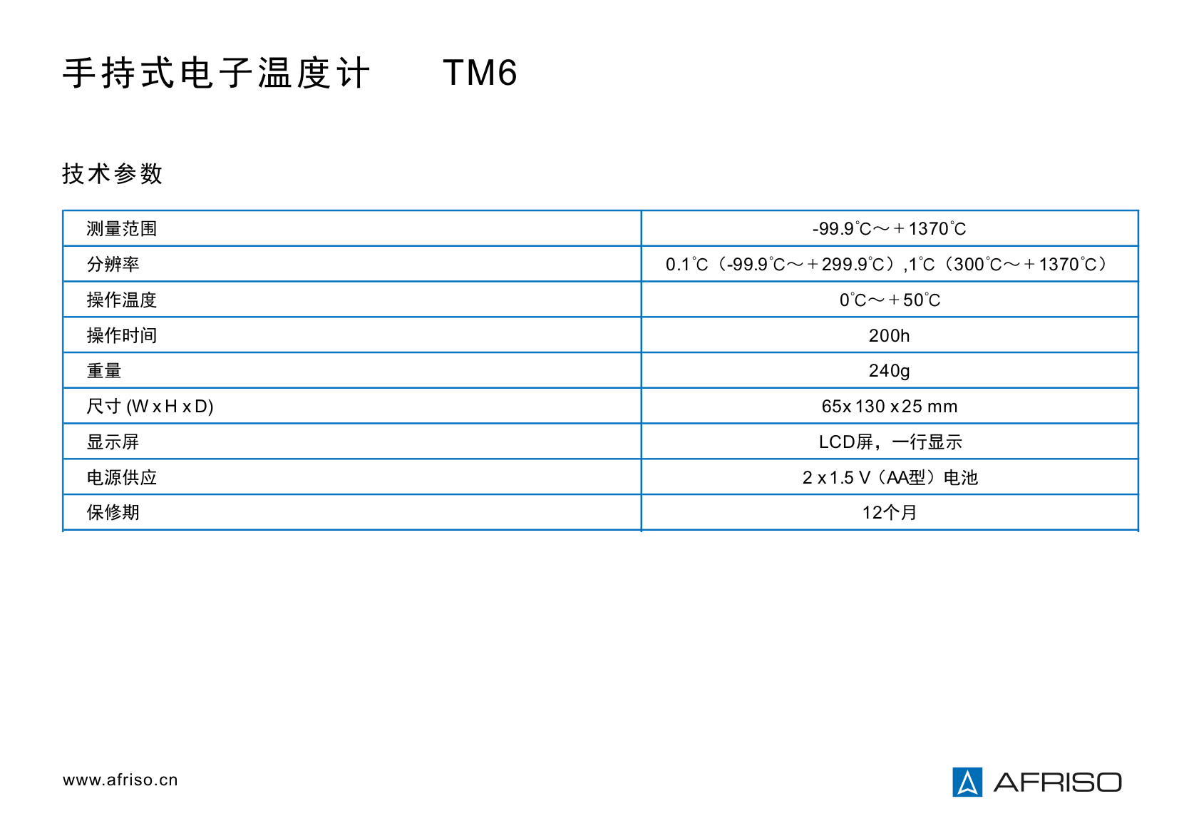 TM6是一款輕便、手持式電子測溫儀,操作直觀、簡便。設備配備了最小/最大值鎖定功能,可以存儲19組測量數據。除此之外,設備還可以修正測量值,例如傳感器誤差補償。 |